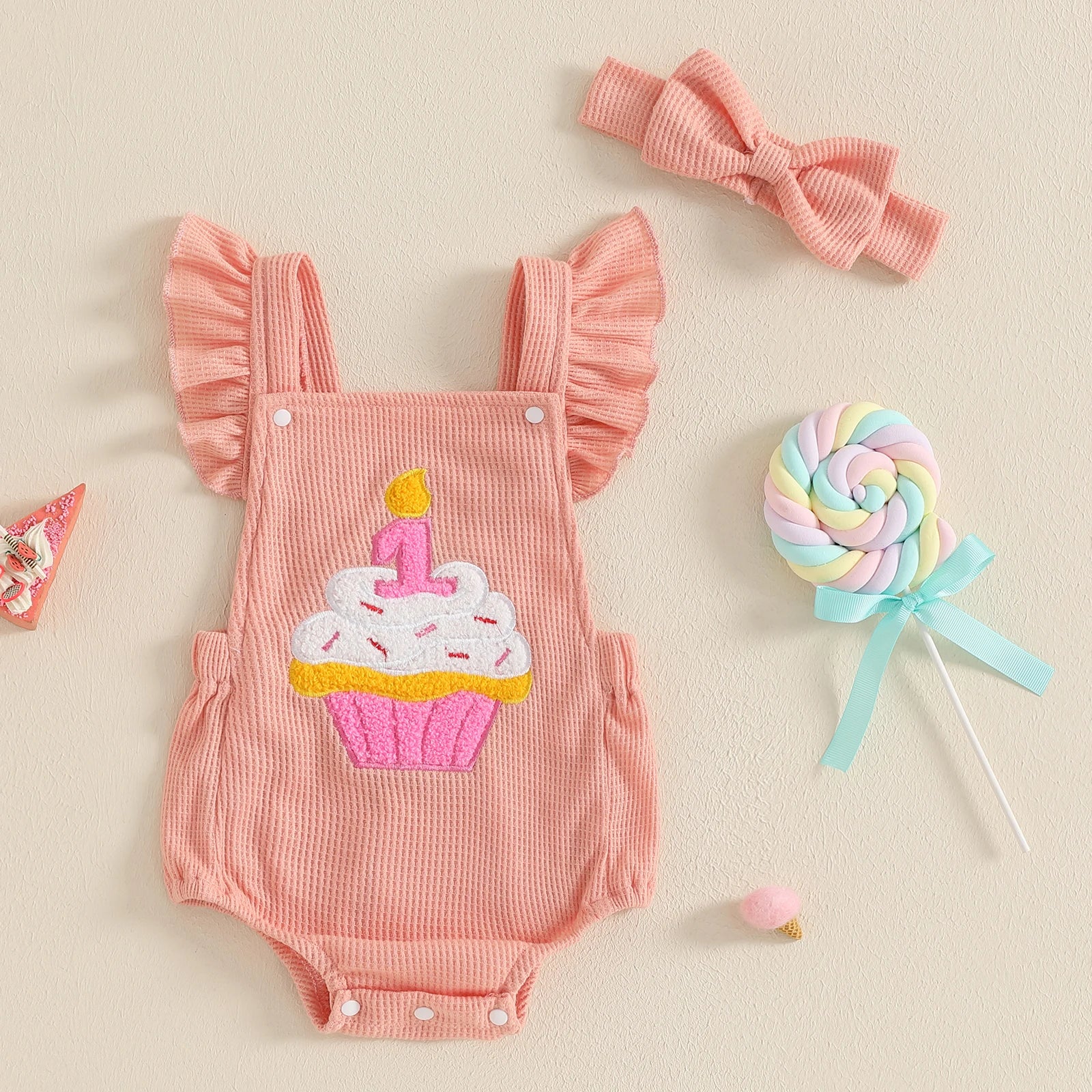 Celebrate your little one's first birthday in style with this charming romper. Featuring a playful cupcake embroidery topped with a single candle, it’s the perfect outfit for making sweet memories. Soft and comfortable, this romper combines festive fun with cozy wearability for your birthday star.