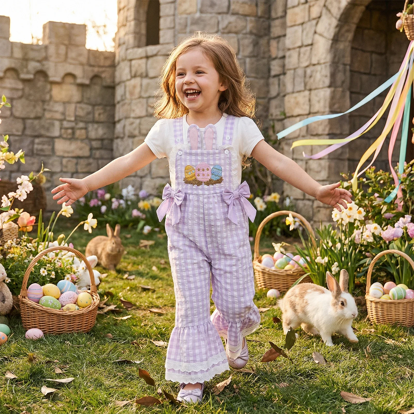 Hop into spring with these delightful gingham overalls! Featuring charming bunny ears and frilly flared trims, they're perfect for little ones who love a touch of whimsy. Choose from four adorable colours, each adorned with sweet Easter embroidery that captures the magic of the season. Comfortable, cute, and bursting with personality—these overalls are sure to become a favourite in any child's wardrobe.