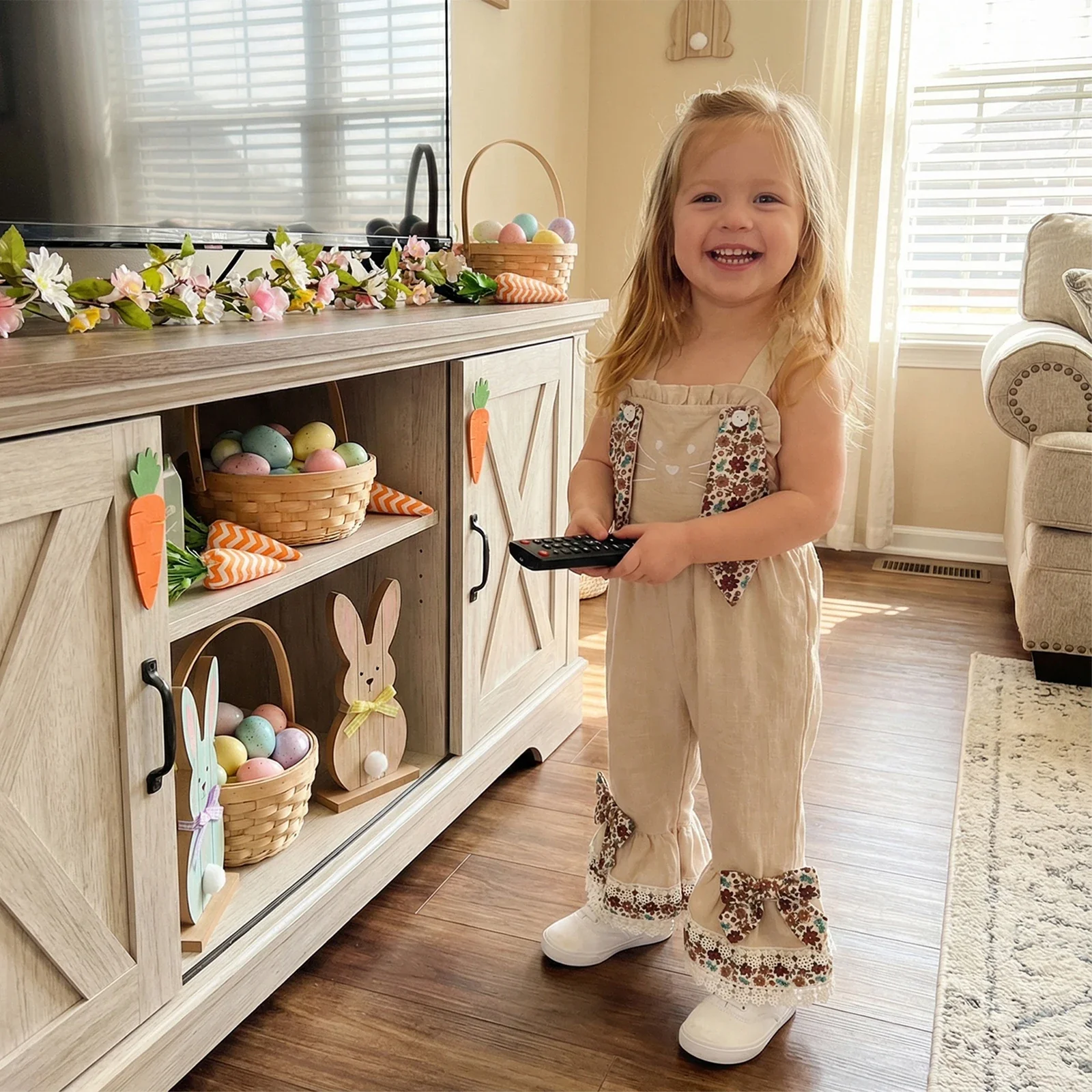 Introducing the Flopsy Bunny Dungarees – a delightful choice for little ones who love all things cute and playful. These charming dungarees feature flared ruffle trousers with delicate floral trim and an adorable bunny face design. The standout detail? Attachable floral bunny ears that button on for extra fun and personality.