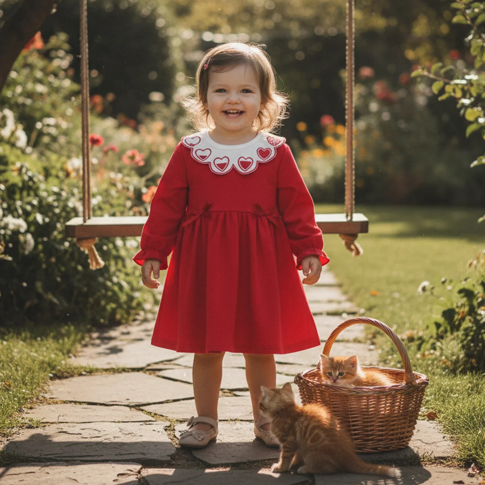 Twirl into springtime in this charming red cotton dress, complete with delicate white scalloped collar and sweet heart embroidery that celebrates all things lovely. Adorable bows add a touch of whimsy, while the soft cotton keeps her comfortable all day long. Perfect for special occasions or everyday adventures, this dress is sure to make her feel absolutely fabulous.