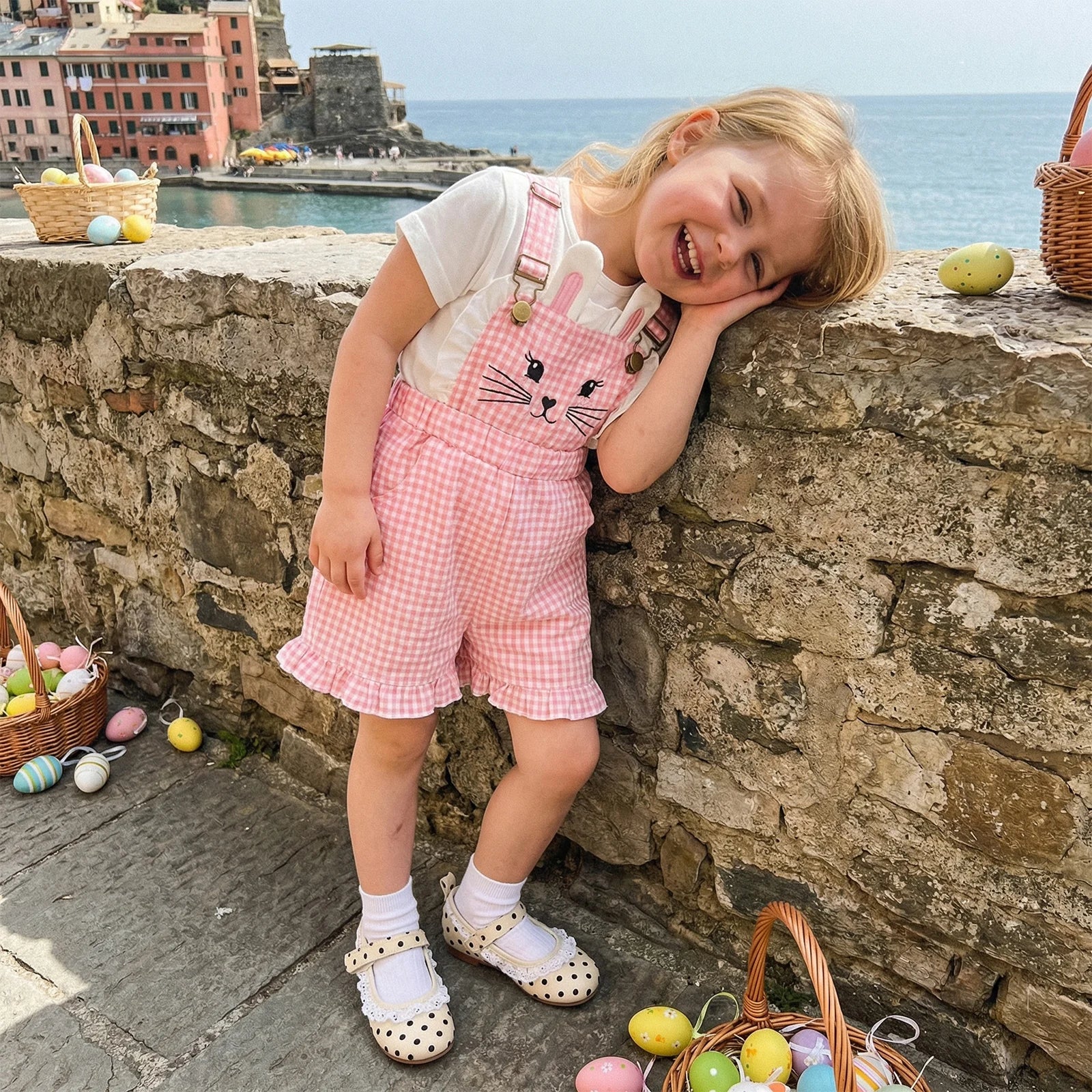 These charming gingham dungarees are perfect for little ones who love playful style. Featuring adorable bunny ears and embroidered face details, they're sure to bring smiles. The ruffled trim shorts add an extra touch of sweetness, while the comfortable cotton-polyester blend keeps her cool and comfortable all day long. An irresistible choice for any bunny-loving child.
