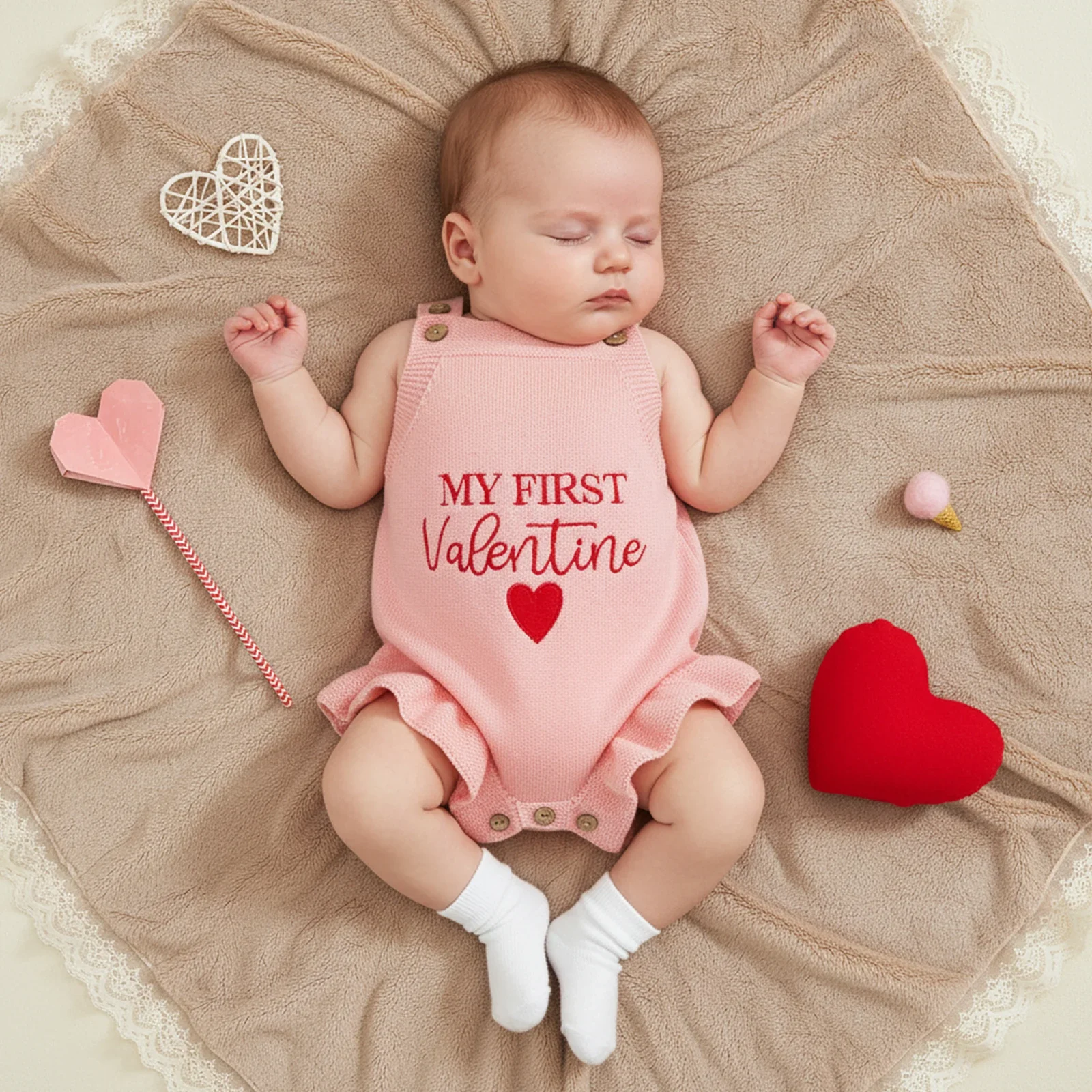 Celebrate your little one's first Valentine's Day in style with this utterly charming knitted romper. Crafted from soft, cosy fabric, it features an adorable "My First Valentine's" embroidery across the front that's sure to melt hearts. The relaxed fit makes it perfect for layering over long sleeves during chilly months, while the sweet design captures those precious early moments. Ideal for photos, special occasions, or simply spreading love every day.